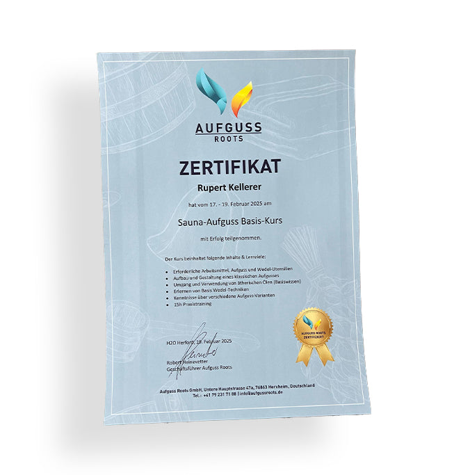 Das Aufguss Roots Zertifikat wird nur bei vollständiger Teilnahme an allen 3 Tagen ausgestellt.